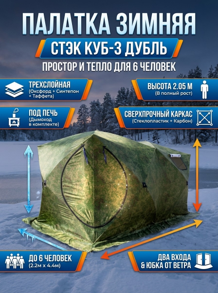 Палатка СТЭК КУБ-3 ДУБЛЬ Пиксель - ОписаниеПалатка КУБ-3 ДУБЛЬ Пиксель – идеальный выбор для зимней рыбалки и отдыха! Рыбалка – это не просто хобби, а стиль жизни. Для комфортного времяпрепровождения на природе в холодное время года важно выбрать надежную и теплую палатку. Палатка КУБ-3 ДУБЛЬ – это трехслойная утепленная модель, созданная специально для зимней рыбалки, охоты и экстремального туризма.