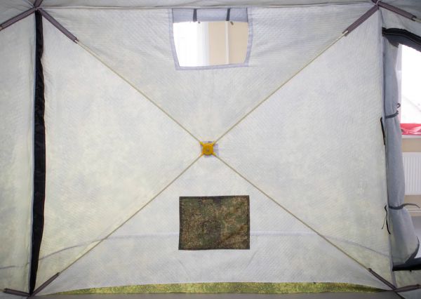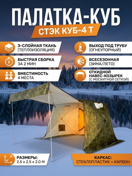 Палатка СТЭК КУБ-4 Т (трехслойная) камыш с навесом +сетка - ОписаниеПалатка КУБ 4 (трехслойная, камуфляж камыш с навесом) Времяпровождение в компании друзей на свежем воздухе – это замечательный вариант отлично провести выходные. Но, что делать, если за окном зима, а вы хотите на рыбалку?! Решение данной проблемы простое, нужно просто купить современную и надежную палатку, такую как КУБ 4 (камуфляж с навесом). Данная модель проста в установке, которая не займет много времени. Палатка имеет трехслойный тент, благодаря чему вы будете защищены от ветра, и сможете находиться в комфортной температуре.