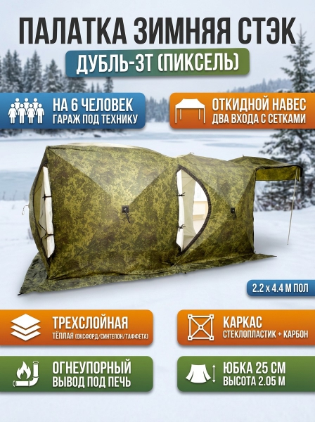Палатка СТЭК ДУБЛЬ-3Т (трехслойная) пиксель с навесом+ сетка - ДоставкаДоставка по Санкт-Петербургу: бесплатно, 2-3 дня Доставка по России: стоимость уточняйте у оператора. Палатка СТЭК ДУБЛЬ-3Т (трехслойная) пиксель с навесом+ сетка - Отзывы0.0