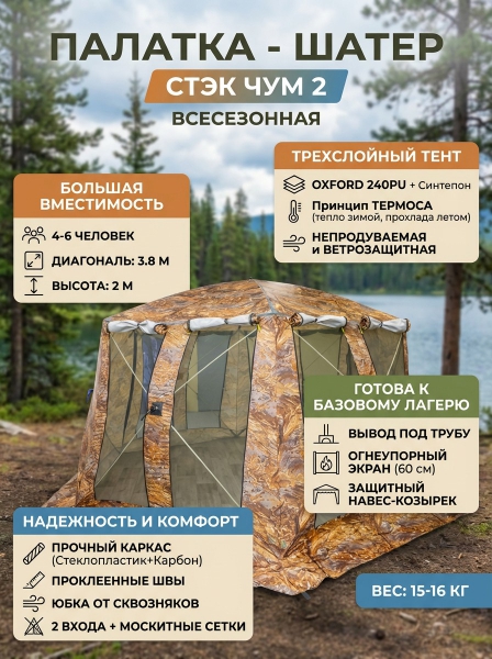 Палатка - Шатер СТЭК Чум 2 однослойный - ОписаниеПалатка Шатёр ЧУМ 2 — больше пространства, надёжности и комфорта. ЧУМ 2 — усовершенствованная модель шатра, разработанная на базе проверенной временем конструкции. Этот шестигранный шатёр сочетает в себе вместительность, устойчивость и практичность, делая его отличным выбором для охоты, рыбалки, кемпинга или организации базового лагеря в сложных погодных условиях.