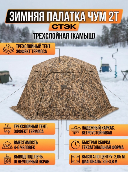 Зимняя палатка для рыбалки СТЭК ЧУМ 2Т (трехслойная) камыш - ОписаниеПалатка ЧУМ 2 от уральского производителя – это идеальный выбор для зимней рыбалки. Она предназначена для комфортного отдыха четырех и более человек в самых сложных погодных условиях.