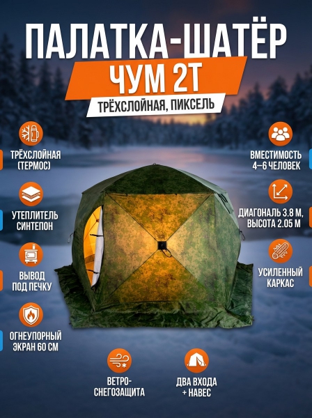 Палатка СТЭК ШАТЁР ЧУМ 2Т (трехслойная)пиксель - ОписаниеПалатка ЧУМ 2 от уральского производителя – это идеальный выбор для зимней рыбалки. Она предназначена для комфортного отдыха четырех и более человек в самых сложных погодных условиях.