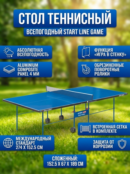 Стол теннисный с сеткой Start Line Game всепогодный синий - ДоставкаДоставка по Санкт-Петербургу: бесплатно, 2-3 дня Доставка по России: стоимость уточняйте у оператора. Стол теннисный с сеткой Start Line Game всепогодный синий - Отзывы4.8