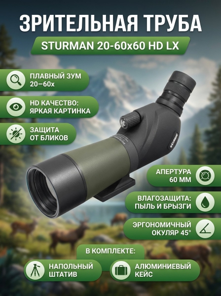 Зрительная труба STURMAN 20–60x60 HD LX - ДоставкаДоставка по Санкт-Петербургу: бесплатно, 2-3 дня Доставка по России: стоимость уточняйте у оператора. Зрительная труба STURMAN 20–60x60 HD LX - Отзывы0.0