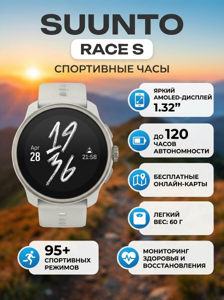 Спортивные часы Suunto Race S Powder Grey Серый - ОписаниеSuunto Race S имеет все возможности для тренировок и поддержку для занятий спортом на открытом воздухе, которые знакомы вам из Suunto Race. Улучшите свою результативность, соблюдая баланс между тренировками и восстановлением, а также пользуйтесь навигацией по бесплатным онлайн-картам.