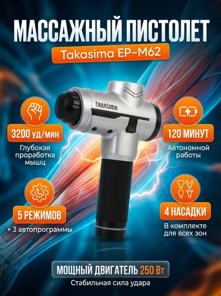Массажный пистолет Takasima ЕР-М62 - ДоставкаДоставка по Санкт-Петербургу: бесплатно, 2-3 дня Доставка по России: стоимость уточняйте у оператора. Массажный пистолет Takasima ЕР-М62 - Отзывы0.0