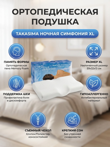 Ортопедическая подушка Takasima «Ночная Симфония» XL - ОписаниеОртопедическая подушка «Ночная симфония» сама сохраняет правильную форму для головы и шеи, гарантируя здоровый и крепкий сон.