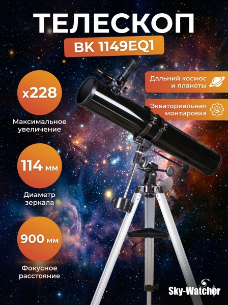 Телескоп рефлекторный Sky-Watcher BK 1149EQ1 - ОписаниеТелескоп BK 1149EQ1 – это качественный рефлектор Ньютона на экваториальной монтировке EQ1. С помощью этого телескопа можно увидеть десятки галактик, шаровых звездных скоплений, планетарных и диффузных туманностей. Кроме того, телескоп можно использовать и для наблюдения объектов Солнечной системы.