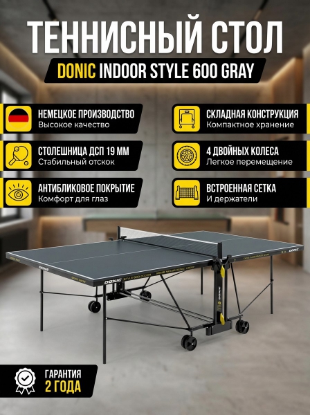 Теннисный стол DONIC INDOOR STYLE 600 GRAY - БрендНемецкий бренд Donic представляет широкий ассортимент спортивного инвентаря, одежды и аксессуаров для настольного тенниса.