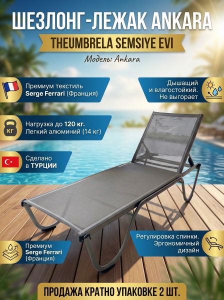 Шезлонг-лежак металлический THEUMBRELA SEMSIYE EVI Ankara - ОписаниеШезлонг Ankara - идеальный выбор для релаксации на открытом пляже или возле бассейна, а также в закрытой зоне отдыха спа-комплекса, санатория, аквапарка.
