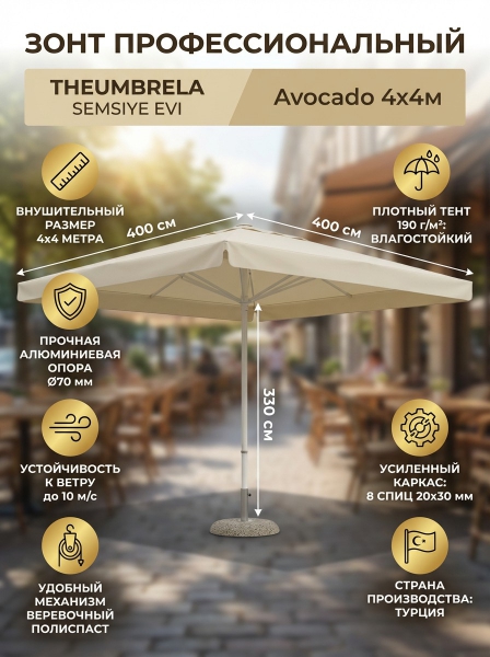 Зонт профессиональный садовый Theumbrela Semsiye Evi Avocado 60-2021-44/W/V-H3300 - ДоставкаДоставка по Санкт-Петербургу: бесплатно, 2-3 дня Доставка по России: стоимость уточняйте у оператора. Зонт профессиональный садовый Theumbrela Semsiye Evi Avocado 60-2021-44/W/V-H3300 - Отзывы0.0