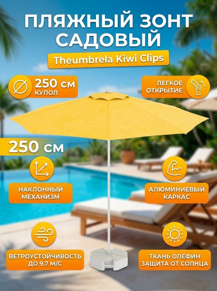 Зонт пляжный профессиональный садовый Theumbrela Semsiye Evi Kiwi Clips 50-1011-25/TILT/W/2619 - ДоставкаДоставка по Санкт-Петербургу: бесплатно, 2-3 дня Доставка по России: стоимость уточняйте у оператора. Зонт пляжный профессиональный садовый Theumbrela Semsiye Evi Kiwi Clips 50-1011-25/TILT/W/2619 - Отзывы0.0