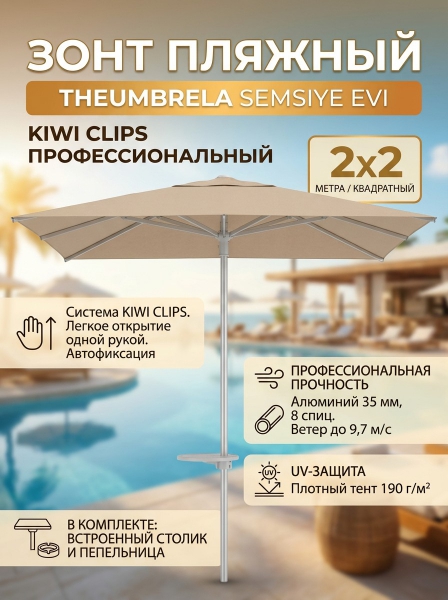 Зонт пляжный THEUMBRELA SEMSIYE EVI Kiwi Clips профессиональный, 2х2 м - ДоставкаДоставка по Санкт-Петербургу: бесплатно, 2-3 дня Доставка по России: стоимость уточняйте у оператора. Зонт пляжный THEUMBRELA SEMSIYE EVI Kiwi Clips профессиональный, 2х2 м - Отзывы0.0