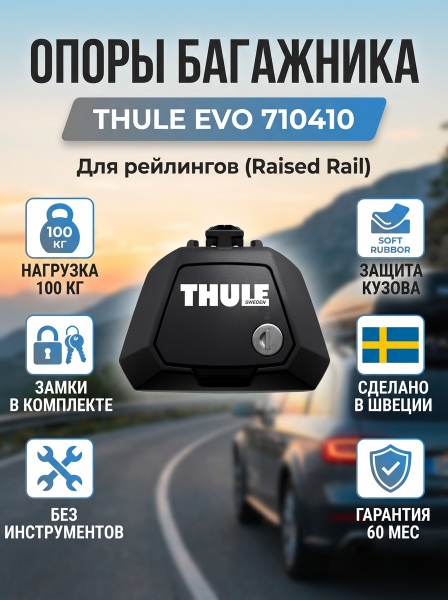 Упоры для обычных рейлингов Thule Evo 710410 (с замками) - ОписаниеОпоры для багажников Thule Evo. Фиксируется на автомобиле с помощью замков системы Thule One-Key (входят в комплект).