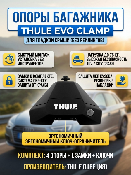 Упоры Thule Evo 710500 с гладкой крышей - ОписаниеОпоры для багажников Thule Evo. Фиксируется на автомобиле с помощью замков системы Thule One-Key (входят в комплект).