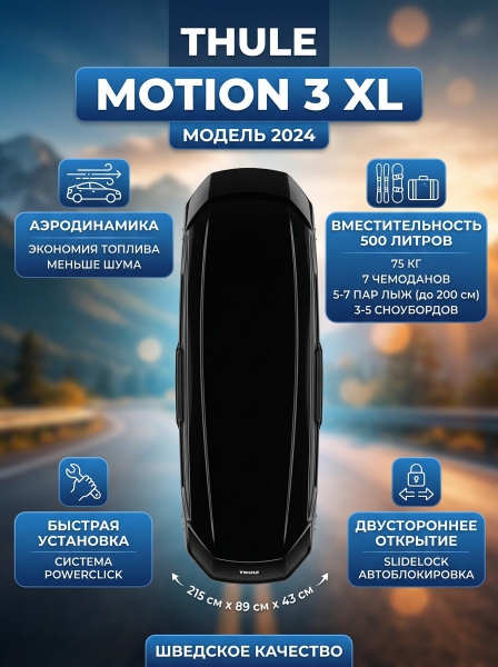 Бокс Thule Motion 3 XL - ОписаниеБудь то семейный отпуск, поездка с собакой или лыжное приключение, Thule Motion 3 — идеальное сочетание вместительности, эффективности и стиля. Улучшенная аэродинамика и расширенный размерный ряд, в который вошли новые варианты с низким профилем, позволяет Thule Motion 3 более эффективно использовать топливо без ущерба для объема хранения. Открывать для себя новые горизонты стало гораздо проще благодаря нашим легким в установке и удобным в эксплуатации решениям, а также инновационным аксессуарам.