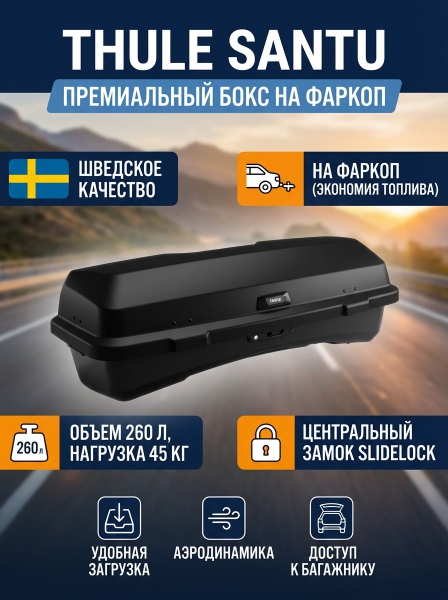 Автомобильный бокс на фаркоп Thule Santu для Epos, EasyFold 3, EasyFold XT - ОписаниеThule Santu — это жесткий грузовой бокс для крепления на фаркоп, который аккуратно устанавливается на велокрепления Thule Epos, Thule EasyFold 3 и Thule EasyFold XT (для Thule EasyFold XT требуется дополнительный комплект крепления). С этим практичным грузовым боксом вы теперь можете использовать ваши велокрепления Thule Epos для 2 велосипедов, Thule EasyFold 3 или Thule EasyFold XT для перевозки велосипедов или снаряжения, а Thule Epos для 3 велосипедов — для перевозки и того, и другого одновременно. Аэродинамический низкий профиль снижает лобовое сопротивление и оставляет место на крыше для большего количества багажа.