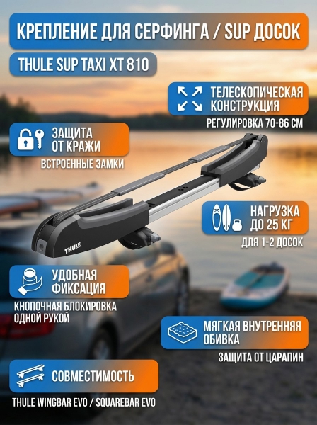 Крепление для перевозки доски для серфинга Thule SUP Taxi 810 - ОписаниеБезопасность и удобство использования превратили Thule SUP Taxi XT в самое популярное крепление для перевозки досок для SUP-серфинга на рынке.