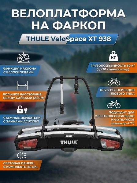 Платформа на фаркоп Thule VeloSpace XT для 2-х велосипедов - ОписаниеПлатформа на фаркоп Thule VeloSpace XT 938 может использоваться для одновременной перевозки двух велосипедов. Данная модель оснащена световой панелью и имеет площадку для размещения номерного знака.