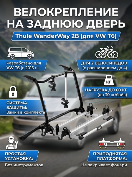 Крепление на заднюю дверь Thule WanderWay 2B для Volkswagen T6 911001 - ОписаниеЛучший в линейке стеллаж для хранения велосипедов с приподнятой платформой, предназначенный для установки на заднюю дверь минивэна Volkswagen T6.