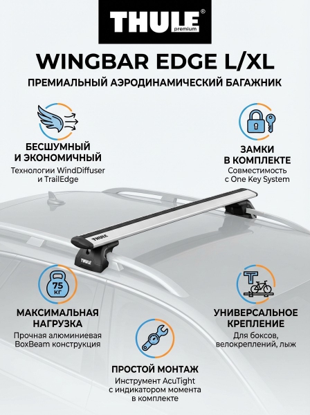 Багажник Thule WingBar Edge (на Fixpoint/интегр. рейлинги) Длина дуг L/XL - ОписаниеБагажники в сборе «все в одном» Thule WingBar Edge. Низкий профиль конструкции Thule WingBar Edge идеально дополняет линию крыши автомобиля. Усовершенствованная аэродинамическая форма в сочетании с TrailEdge и WindDiffuser минимизирует шум и повышает топливную эффективность. Благодаря элегантной и оптимизированной форме Thule WingBar Edge также идеально подходит для случаев, когда вы не используете багажник, но не хотите его снимать.
