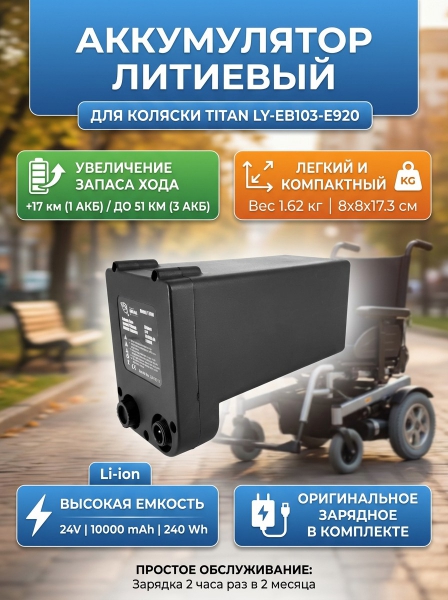 Аккумулятор литиевый к инвалидной коляске Titan LY-EB103-E920 (арт. A920) - ОписаниеАккумулятор к электрической инвалидной коляске LY-EB103-E920 (литиевый). Может быть установлен как дополнительный аккумулятор, тем самым увеличив пробег коляски на 17 км! Один АКБ -17 км, два АКБ -34 км, три АКБ -51 км.