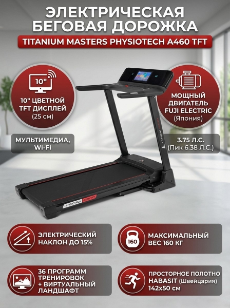 Электрическая беговая дорожка Titanium Masters Physiotech A460 TFT - ДоставкаДоставка по Санкт-Петербургу: бесплатно, 2-3 дня Доставка по России: стоимость уточняйте у оператора. Электрическая беговая дорожка Titanium Masters Physiotech A460 TFT - Отзывы0.0