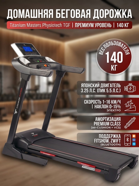 Домашняя беговая дорожка Titanium Masters Physiotech TGF - ОписаниеСомневаетесь? - Посмотрите рейтинг ТОП-10 по категории «Домашние беговые дорожки»Titanium Masters Physiotech TGF – это не только великолепные технические характеристики и биомеханические показатели, но и интеграция со сторонними приложениями, выводящими тренировки на новый качественный уровень. Через встроенный в консоль Bluetooth модуль и смартфон можно синхронизироваться с приложениями Fitshow и Zwift.