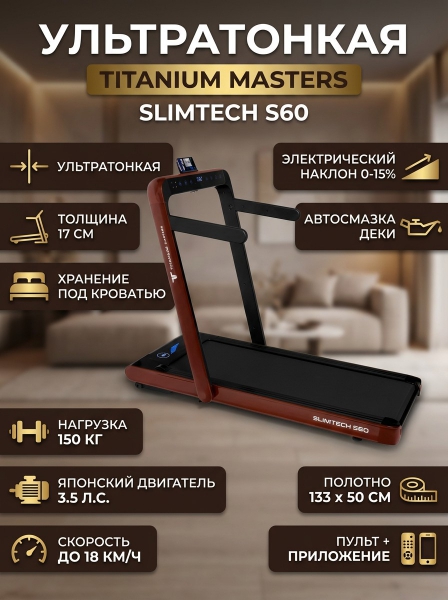 Ультратонкая беговая дорожка Titanium Masters Slimtech S60 - ДоставкаДоставка по Санкт-Петербургу: бесплатно, 2-3 дня Доставка по России: стоимость уточняйте у оператора. Ультратонкая беговая дорожка Titanium Masters Slimtech S60 - Отзывы0.0