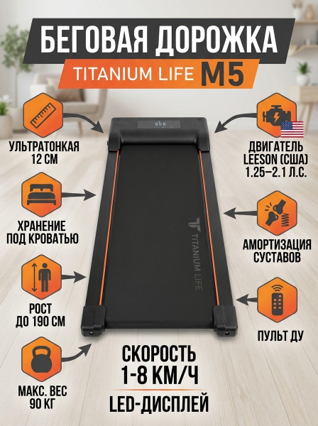 Беговая дорожка Titanium Life M5 - ОписаниеСомневаетесь? - Посмотрите рейтинг ТОП-10 по категории «Домашние беговые дорожки»Безусловными преимуществами электрической беговой дорожки Titanium Life M5 являются компактные размеры и демократичная стоимость. Несмотря на то, что тренажер относится к базовому классу оборудования, он закрывает все основные потребности пользователей начального и среднего уровня.