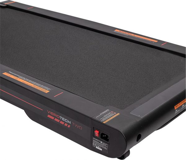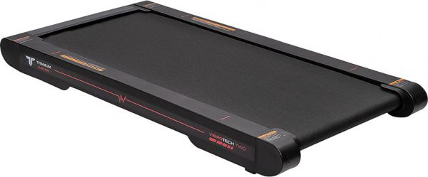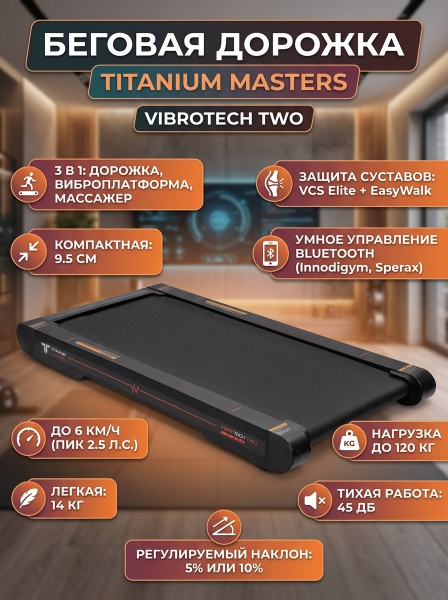 Беговая дорожка TITANIUM Masters Vibrotech Two - ОписаниеСомневаетесь? - Посмотрите рейтинг ТОП-10 по категории «Беговые дорожки»Беговая дорожка Masters Vibrotech Two с функцией вибрации является революционной в сфере фитнеса! Это компактное устройство, которое можно легко перемещать одной рукой и хранить под кроватью(высота 9см), выполняет функции сразу трёх устройств: беговой дорожки c регулировкой угла наклона, виброплатформы и расслабляющего массажёра для ног! Компактность и одновременно прочность – уникальное сочетание в Vibrotech Two. Ведь дорожка при размерах всего 115см в длину, 57см в ширину, 9,5см в высоту и весом 14кг выдерживает пользователей весом до 120 кг! Стильный дизайн, качественное исполнение и уникальный функционал делают Masters Vibrotech Two незаменимым помощником у вас дома, кардинально меняя ваши тренировки. Управление дорожкой происходит с помощью простого и удобного пульта управления, а также для удобства использования в беговую дорожку интегрировано приложение INNODIGYM (подключение через Bluetooth), с помощью приложения вы сможете управлять устройством в режиме бега или режиме вибрации, а также вести планы тренировок и соревноваться с другими пользователями. За движение отвечает инновационный двигатель пиковой мощностью 2.5 л.с. постоянного тока. Скорость регулируется в диапазоне от 0.3 до 6 км/ч (с переходом по 0.1км/час) - на максимуме этого вполне хватает для лёгкого бега. Двигатель способен работать в колебательном режиме, что позволяет использовать тренажёр в качестве вибро устройства. Имеет низкий уровень шума – 45 дцб и высокий уровень надежности. Для увеличения нагрузки и разнообразия в тренировках в дорожку установлена система быстрой регулировки угла наклона - Simple manual adjustable incline™, за считанные секунды Вы сможете установить угол наклона на 5% или 10%, что значительно увеличить нагрузку во время тренировки!