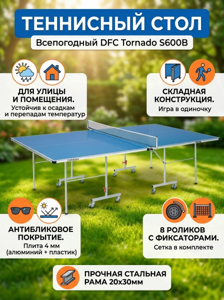 DFC Tornado S600B - складной стол для настольного тенниса, позволяющий играть как в паре, так и одному, установив одну из секций вертикально. Алюминиевое покрытие игровой плиты с пятислойной покраской и сетка из нейлона хорошо выдерживают воздействие влаги. Наличие транспортировочных роликов позволяет легко перемещать сложенный стол.