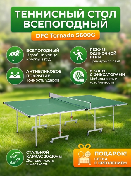 Теннисный стол с сеткой DFC Tornado S600G - ДоставкаДоставка по Санкт-Петербургу: бесплатно, 2-3 дня Доставка по России: стоимость уточняйте у оператора. Теннисный стол с сеткой DFC Tornado S600G - Отзывы4.8
