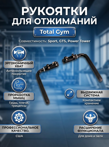 Опция рукояти для отжиманий (пара) Total Gym 5106-01 - ОписаниеСомневаетесь? - Посмотрите рейтинг ТОП-10 по категории «Силовые тренажеры»Аксессуар для тренажеров Total Gym - выдвижные рукояти для отжиманий. Хранение под корпусом.