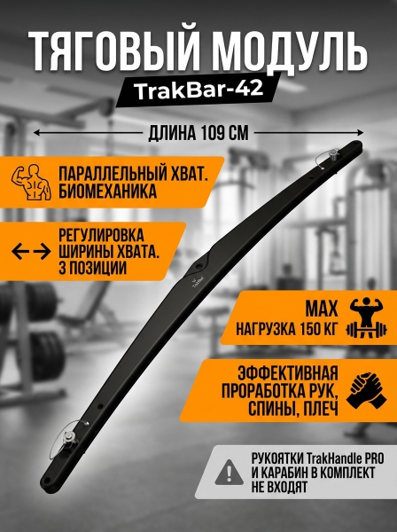 Тяговый модуль TrakHandle TrakBar-42 - ОписаниеСомневаетесь? - Посмотрите рейтинг ТОП-10 по категории «Силовые тренажеры»TrakBar 42 предназначен для использования с двумя рукоятками TrakHandle PRO, которые подсоединяются к тяге с помощью подпружиненных фиксаторов, исключающих самопроизвольное отсоединение рукояток от тяги.