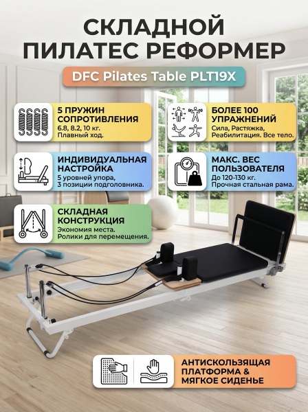 Силовой тренажер DFC Pilaes table PLT19X - ОписаниеСомневаетесь? - Посмотрите рейтинг ТОП-10 по категории «Силовые тренажеры»Стол для пилатеса (реформер) с деревянными вставками — это современный и многофункциональный тренажёр, созданный для комфортных и эффективных тренировок в домашних условиях. Он позволяет прорабатывать все группы мышц, развивать гибкость, выносливость и улучшать осанку.