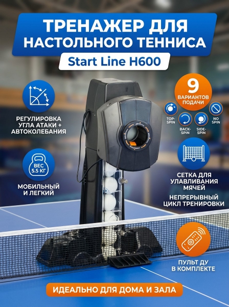 Тренажер для настольного тенниса Start Line H600 - ОписаниеРобот/Тренажер для настольного тенниса H600 предназначен для ежедневных тренировок как для начинающих спортсменов, так и для профессионалов. Имеет несколько режимов работы.