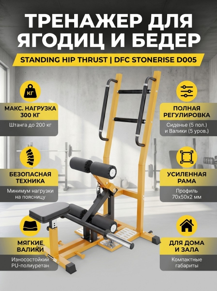 Тренажер для полуприседа (Standing Hip Thrust) DFC STONERISE D005 - ОписаниеСомневаетесь? - Посмотрите рейтинг ТОП-10 по категории «Мультистанции»Тренажер для полуприседа STONERISE D005 – это профессиональное решение для домашних тренировок, позволяющее эффективно развивать мышцы ног и ягодиц. Благодаря надежной конструкции и удобным регулировкам, тренажер подходит для пользователей разного уровня подготовки и гарантирует комфорт во время занятий.