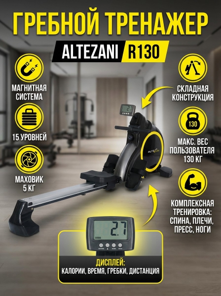 Магнитный гребной тренажер Altezani R130 - ОписаниеСомневаетесь? - Посмотрите рейтинг ТОП-10 по категории «Домашние гребные тренажеры»R130 - модель для тренировок в домашних условиях, сочетающая в себе приятный дизайн и эффективность тренировок. Тренажер создает эффективную кардионагрузку, позволяет нагружать мышцы спины.