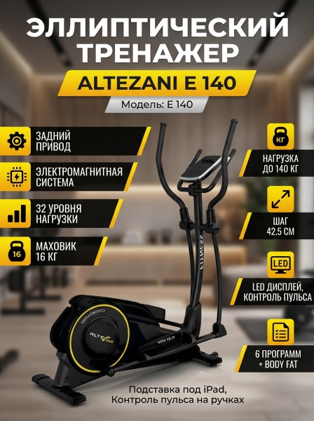 Эллиптический тренажер заднеприводный Altezani E 140 - ДоставкаДоставка по Санкт-Петербургу: бесплатно, 2-3 дня Доставка по России: стоимость уточняйте у оператора. Эллиптический тренажер заднеприводный Altezani E 140 - Отзывы0.0