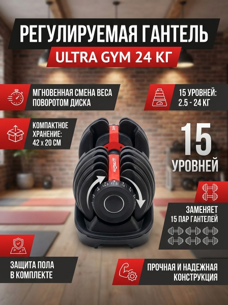 Гантель Ultra Gym Регулируемая гантель - ДоставкаДоставка по Санкт-Петербургу: бесплатно, 2-3 дня Доставка по России: стоимость уточняйте у оператора. Гантель Ultra Gym Регулируемая гантель - Отзывы0.0