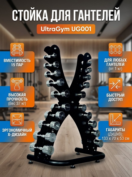 Стойка для гантелей UltraGym UG001 - ОписаниеСомневаетесь? - Посмотрите рейтинг ТОП-10 по категории «Стойки для гантелей»Стильная Х-образная стойка для гантелей. Гантели попарно располагаются с двух сторон стойки. Подходят для хромированных и гексагональных гантелей