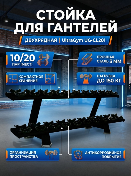 Стойка для гантелей двухрядная UltraGym UG-CL201 (на 10 пар) - ДоставкаДоставка по Санкт-Петербургу: бесплатно, 2-3 дня Доставка по России: стоимость уточняйте у оператора. Стойка для гантелей двухрядная UltraGym UG-CL201 (на 10 пар) - Отзывы0.0