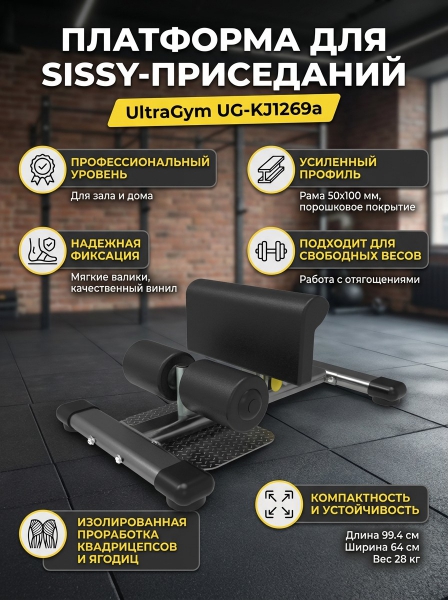 Платформа для приседаний UltraGym UG-KJ1269а - ОписаниеСомневаетесь? - Посмотрите рейтинг ТОП-10 по категории «Силовые тренажеры»Тренажер предназначен для проработки квадрицепсов. Sissy-приседы — хорошая альтернатива выпадам со штангой на плечах. Тренировки дают результаты, равные четырем обычным тренировкам любому атлету независимо от его уровня подготовленности. Тренажер допускает как упражнения с весом собственного тела, так и работу с дополнительными отягощениями: штангой, блинами, гирями или гантелями.