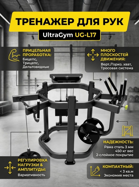 Тренажер для рук UltraGym UG-L17 - ОписаниеПредназначен для тренировки мышц рук и плечевого пояса. Это многофункциональный станок для изолированной тренировки бицепсов, трицепсов и плеч.