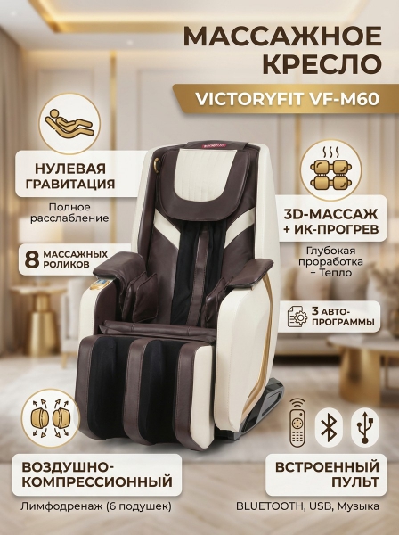 Массажное кресло VictoryFit VF-M60 - ОписаниеМассажное кресло сделает массаж незабываемым благодаря своим функциям. Кресло включает четыре управляемых массажных колеса, подвижную массажную группу в спинке кресла, включающие следующие типы массажа: Шиацу (точечное воздействие на некоторые зоны, достаточно ощутимое давление на эти точки), воздушно-компрессионный массаж и разминающий массаж.