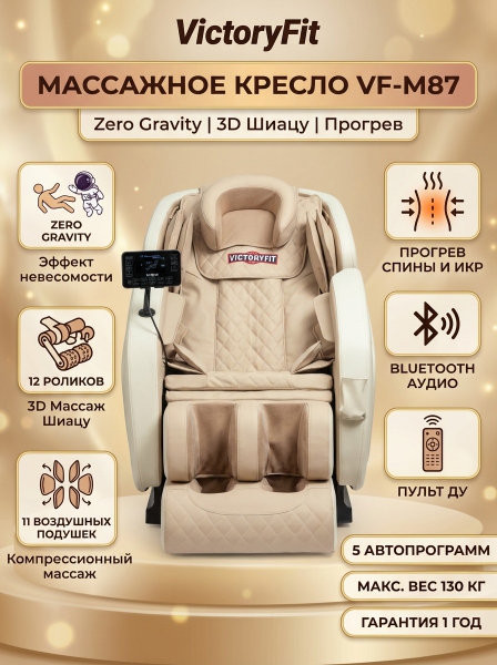 Массажное кресло VictoryFit VF-M87 - ОписаниеМассажное кресло VictoryFit VF-M87 позволит ощутить незабываемые ощущения от массажа всего тела. Кресло включает подвижные массажные группы роликов в поясничном отделе, спинном, шейном отделе, а также массажную группу роликов под ягодицами и стопами. Воздушно-компрессионный массаж голени, рук, ягодиц, плеч, головы. Предусмотрены следующие типы массажа: Шиацу (точечное воздействие на некоторые зоны, достаточно ощутимое давление на эти точки), воздушно-компрессионный и разминающий массаж.
