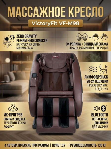 Массажное кресло VictoryFit VF-M98 - ОписаниеСомневаетесь? - Посмотрите рейтинг ТОП-10 по категории «Массажные кресла»Массажное кресло VictoryFit VF-M98. Позволит ощутить незабываемые ощущения от массажа всего тела за разумную стоимость. С помощью нашего массажного кресла вы повысите свой жизненный тонус, избавитесь от болевых ощущений в пояснице, спине и шейном отделе, нормализуете кровообращение в тканях, получите глубокое разминание всех мышц, реабилитируетесь после травмы или болезни, снимите мышечное напряжение после физической активности