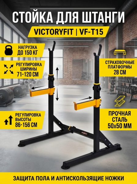 Стойка для штанги VictoryFit VF-T15 - ОписаниеСтойка для штанги VictoryFit VF-T15 выполнена из стального профиля 50×50 мм, толщиной 1.5 мм, покрытого порошковой краской. Оснащена съемными регулируемыми страховочными платформами. Стойка регулируется по ширине и высоте, подойдет под любой размер грифа. Стойку можно использовать как для жима лежа, так и для приседаний со штангой. Резиновые ножки не позволят стойке скользить по полу и портить его поверхность. Стойка для штанги VictoryFit VF-T15 идеально подходит для использования в комплексе с силовой скамьей VictoryFit VF-T22.