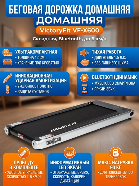 VictoryFit VF-X600 это компактная беговая дорожка для ходьбы, когда скорость беговой ленты составляет от 1-6 км/ч.